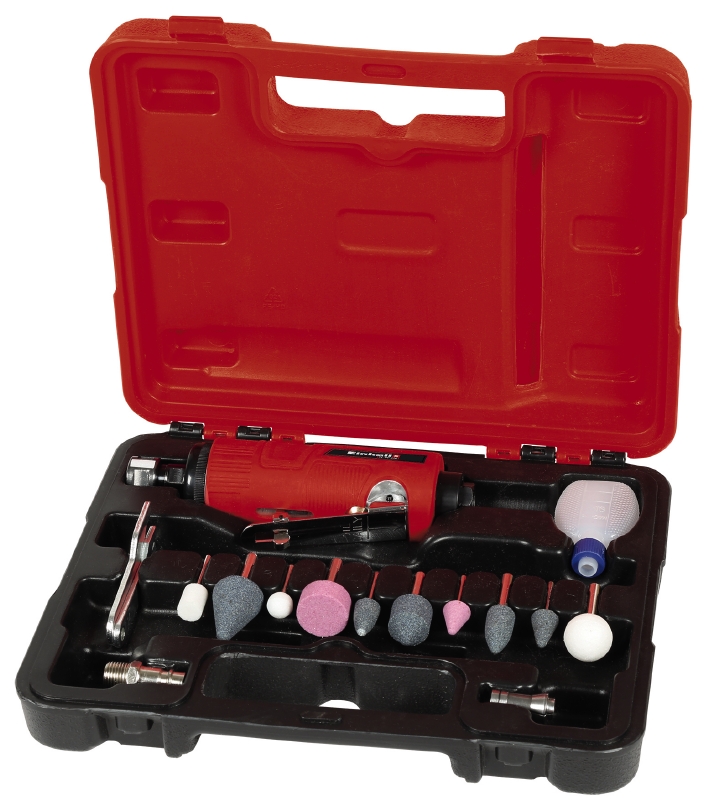 Пневматичний прямий гравер Einhell TC-PP 220 - це зручний інструмент для використання вдома, на робочих площадках або в гаражі. Для безпечної роботи гравер має нековзну прогумовану рукоятку. Цей потужний прецизійний інструмент зі швидкістю обертів до 22000 об/хв дуже допомагає при шліфуванні, поліруванні, гравіруванні та видаленні задирок. Найкращі результати роботи досягаються при використанні шлангу з внутрішнім діаметром не менше ніж 9 мм. Гравером зручно працювати однією рукою. Важіль спускового гачка запобігає ненавмисному пуску. В комплект поставки входять набір з 10 шліфувальних насадок. Також в комплекті є 1 мала пляшка для мастила, 1 ніпель і 2 накидних ключа для зміни приладдя. Гравер поставляється в практичному пластиковому кейсі для транспортування і зберігання.