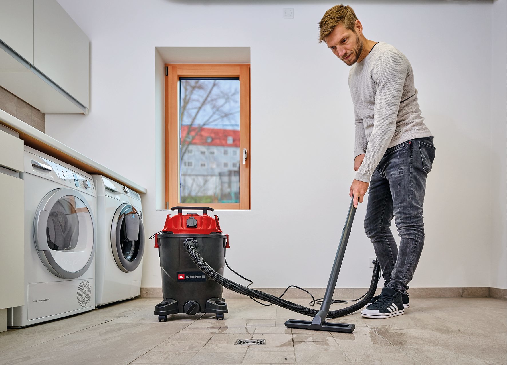 Завдяки потужному всмоктуванню, пилосос для вологого та сухого прибирання Einhell TC-VC 3055 A є потужним інструментом для ретельного прибирання. Пилосос забезпечує дбайливе очищення всіх поверхонь, будь то килими, інші текстильні вироби чи плитка. Салон автомобілів також можна очищати пилососом для вологого та сухого прибирання, будь то сидіння, килими чи оздоблення. Пилосос для вологого та сухого прибирання від Einhell оснащений міцним пластиковим баком об'ємом 30 літрів. Для легкого спорожнення баку вбудований зливний гвинт для води. Система шлангів діаметром 36 мм забезпечує високу пропускну здатність повітря та бруду. З'єднання для видування використовується для видування важкодоступних місць, наприклад, у нішах та закутках або за масивними шафами. Чотири поворотні колеса та вбудована ручка для перенесення забезпечують легке транспортування та гнучкість в експлуатації. Крім того, в корпус вбудована автоматична розетка, до якої можна підключити електроінструменти. Якщо підключений інструмент увімкнено або вимкнено, пилосос для вологого та сухого прибирання також автоматично вмикається або вимикається. Зручні тримачі для шланга та кабелю на корпусі або ручці для перенесення забезпечують їх акуратне використання. У комплект входять всмоктувальний шланг довжиною 2,50 м, комбінована насадка з колесами для килимів та гладких підлог, а також з'єднувальна насадка. Крім того, поролоновий та гофрований фільтри, що входять до комплекту, забезпечують негайне введення в експлуатацію.